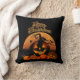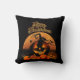 Travesseiro temático do Halloween com abóboras assustadoras, gatos pretos, morcegos, aranhas e lua de cheio sobre fundo negro com saudação Feliz de Halloween.