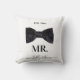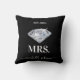 Um elegante casamento preto e branco temia design perfeito para recém casados. O travesseiro decorativo é desenhado em preto e branco com uma gravata de arco preto na moda para o "Sr." e um belo diamante brilhante para a "Sra." A data estabelecida está no topo, que pode ser personalizada para a data do casamento ou uma data memorável em suas vidas. Uma fonte de script elegante é usada para os nomes da noiva e do noivo localizados na parte inferior. Personalize o texto e torne-o seu.