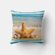 Um travesseiro com uma fotografia fofa de um peixe-estrela posicionado na vertical na areia. Debaixo dos braços estão 2 conchas descansando confortavelmente. Colocada em uma praia com ondas caindo ao fundo.