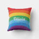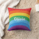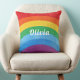 O travesseiro decorativo de Stripes do Arco-Íris personalizado apresenta um travesseiro com padrão de arco-íris colorido com o seu nome em uma letra de script fofinha.