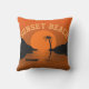 Arte solar tropical alaranjada e preta. Silhuetas de montanhas pretas, palmeiras e barcos pequenos refletidos no mar com um pano de fundo laranja brilhante e texto "Sunset Beach" .