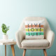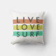 Travesseiro decorativo decorativo branco com listras colorido do sol em pêssego, verde-menta e amarelo impressos com a mensagem "ao vivo, amor, surf". Para as surfistas! A cor de fundo deste design pode ser alterada para cor de sua escolha. Para alterar, use o botão personalizar e escolha sua cor.