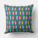 Surge um travesseiro decorativo colorido com padrão de pranchas de surfe. Linhas de pranchas brilhantemente coloridas sobre um fundo negro. presente de excelente para qualquer um, de surfistas profissionais a aqueles que simplesmente amam o surf como hobby. Você pode mudar a cor de fundo da palha escura, para o que lhe convém.