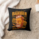The centerpiece of the design features a stylized illustration of a bearded man with a perfectly coiffed pompadour, rendered in rich orange and deep brown tones. Surrounding the figure are the essential tools of the trade: a classic hair comb, a pair of sharp scissors, and a traditional straight razor.