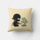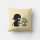 Ninja adorável vestida de preto está sentada de pernas cruzadas perto de uma plantação e regando uma pequena árvore bonsai. A espada japonesa de katana está amarrada nas costas.