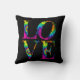 O travesseiro decorativo Groovy apresenta letras de "amor" empilhadas em fundo preto no estilo retrô