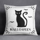 Celebre o Halloween em estilo com este travesseiro decorativo simplesmente assustador, com um gato preto assustador com a inscrição decorativa do "Halloween", sotaques de morcegos de mosca, junto com um pergaminho e uma borda estelar num fundo branco.