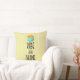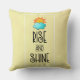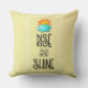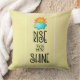 Um travesseiro com um desenho tipográfico bonito. Uma nuvem fofa e um sol laranja sobre um fundo amarelo-claro. Rise and Shine escrito em uma fonte de tendência legal.