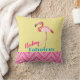 Um travesseiro com uma ilustração gráfica de um flamingo rosa. O texto diz: Fabuloso. Tiras cor-de-rosa desenhadas à mão ao longo do fundo.