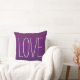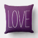 design na moda e travesseiro de sotaque quadrado chic apresentam tons de ameixa profunda, roxo e berinjela com texto "LOVE" em branco.