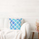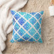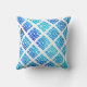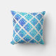 Uma almofada com padrão geométrico de chave tribal e estilo de recorte angular em tons de azul aqua brilhante e branco. Projetado por Sarah Trett. Ficaria ótimo em um quarto, sala ou jardim.