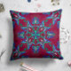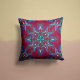 Um padrão de mandala de starburst brilha em tons de azul, lacre e verde contra um fundo magenta rico, criando um centro ousado para qualquer área de assentos.