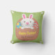 Decorre a sua festa de Páscoa com este travesseiro decorativo do tema da Páscoa, bonito e colorido! Ele tem um coelho branco surgindo da cesta de ovos decorados de Páscoa como padrão de estrelas ou padrão de gesso e pontos. Personalize com sua própria mensagem de saudação no cesto.