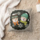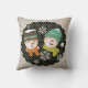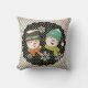 Snowmen Dots and Stripes travesseiro de feriado, tão bonito e colorido, apresenta um fundo branco e diagonal de cinza com um círculo preto com pontos brancos e cada lado tem um casal sorridente de boné, cachecol, nariz de cenoura e flocos de neve!