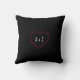 Almofada de lançamento de foto personalizável do Dia dos Namorados com um buquê de rosas vermelhas. Almofada quadrada com moldura de foto de rosa em forma de coração tem fundo preto na frente e atrás, com suas iniciais no verso da almofada. A foto pode ser cortada e posicionada para caber na forma do coração. As camadas podem precisar ser desativadas temporariamente para mover a foto.