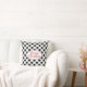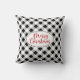 Um padrão de xadrez preto e branco decora este travesseiro, com as palavras Feliz Natal. Um travesseiro decorativo divertido para o seu decoro de Natal. Projetado para você pelo Blackberry Boulevard.