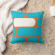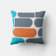 Travesseiro decorativo gráfico moderno, geométrico em alaranjado, em azul, o branco e as cinzas.