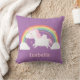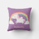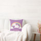 Decore a sala da menina com este travesseiro decorativo mágico bonito do unicórnio! Excelente para o pouco um a abraçar para dormir como vagueia no dreamland. O unicórnio com juba e a cauda cor-de-rosa da cor do algodão doce está voando entre o arco-íris, a nuvem e as estrelas com suas asas minúsculas. Poucos sparkles para esse toque mágico. Personalize com o nome da menina.