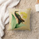 O design de travesseiro decorativo de ao quadrado apresenta uma ilustração antiga do maior membro da família de beija-flores - o Giant Hummingbird (Patagona gigas.) Um beija-flor verde e marrom perches em um arbusto frangipani amarelo, com um fundo aquoso de cor dourada suave.