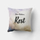 Este travesseiro decorativo elegante tem um palete colorido de azul claro e roxo, creme e azul profundo para ajustado sua decoração caseira. Ele mostra as próprias palavras de Jesus nos lembrando de descansar. Personalize-o facilmente como um presente com o nome da pessoa com quem você se importa que precisa ser lembrada para descansar.