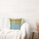 A almofada tem um desenho abstrato de listras tecidas de um lado e é lisa do outro.