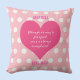 Este travesseiro decorativo faz um presente excelente para sua filha que está fora da faculdade ou acabou de se mudar para uma nova cidade. A travesseiro é rosa claro com bolinhas brancas na frente e atrás. Na frente, está um coração cor-de-rosa mais escuro que diz, "Embora possamos estar distantes, você está sempre no meu coração!" Você pode personalizar o nome da sua filha ao longo do topo e você pode personalizar o amor abaixo do coração. Copyright Kathy Henis