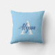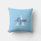 Travesseiro decorativo de Script do Monograma Azul de Calm na moda com um arranjo elegante de nome e monograma inicial num fundo azul claro. O travesseiro é fácil de personalizar digitando o nome e o monograma inicial de sua escolha no modelo de personalização on-line antes de fazer o pedido. O texto copia automaticamente para o outro lado do travesseiro para mostrar o mesmo nome e inicial em cada lado.