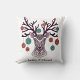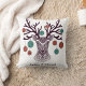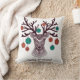 Um travesseiro decorativo quadrado apresenta uma ilustração estilizada de uma cabeça de rena com Enfeites de natal pendurados em suas galhadas, colocados sobre um fundo branco comum. A rena é representada em um estilo detalhado, quase zentangular, com padrões intrincados preenchendo sua face e pescoço. As galhadas são de cor castanho profundo, e os ornamentos são uma mistura de lacre e laranja, cada um com padrões únicos. As palavras "Feliz Natal!" estão escritas em letra cursiva no fundo do travesseiro. O estilo geral é decorativo e festivo, adequado para decoração de férias.