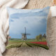 Travesseiro decorativo com uma paisagem com um moinho de vento e umas tulipas amarelas e vermelhas sob um céu nebuloso no campo holandês em um dia bonito da primavera na região do bulbo, os Países Baixos.