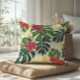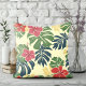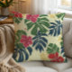 Um padrão floral vermelho e rosa alegre com folhas grandes de monstera verde e azul sobre fundo amarelo macio.