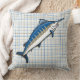 Poucos peixes são incrivelmente bonitos que o espadim azul — e nem muitos peixes são maiores. O espadim azul é o maior dos espadins do Atlântico e, sério, um dos maiores peixes do mundo. Como em algumas espécies, a fêmea é muitas vezes um pouco maior que o macho. As mulheres podem crescer até 14 pés de comprimento e podem pesar mais de 1.900 libras, embora a média corra mais em torno de 11 pés de comprimento e 300 libras. Um azul profundo sobre o topo e o branco-prateado, com uma barbatana dorsal pronunciada e uma mandíbula longa, letal, em forma de lança (que alguns chamam de lei), os espadins azuis são um dos peixes mais facilmente identificáveis e reconhecíveis do mundo. Marlins é renomado por sua incrível resistência em uma luta quando estão viciados, o que os torna um favorito troféu de grandes pescadores de caça. Embora possa ser dito de praticamente qualquer peixe super grande, não consigo imaginar que haja muito mais emocionante para o ávido anjo do que pegar um desses gigantes e vê-lo quebrar a água na luta. Este design homenageia mais este peixe majestoso do que os pescadores que o procuram. Para este maravilhoso travesseiro, um solteiro, espadim azul salta de um mar de xadrez coordenada por cores em ambos os lados, fazer-o a escolha perfeita para a sua piscina, casa de praia ou "caverna do homem".