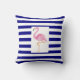 Travesseiro de algodão listrado branco e azul marinheiro com um flamingo rosa.