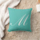 travesseiro de monograma personalizado com uma letra de script clássica M num fundo Turquesa. Fabricado nos EUA a partir de algodão ou poliéster lavável. Perfeito para Mackenzie, Madeline, Madison, Maria, Mariah, Marissa, Mary, Megan, Michelle, Miranda, Monica, Morgan ou qualquer outro nome que comece com a letra M.