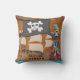 Um garoto pirata afro-americano veste um chapéu com um papagaio sentado na borda. Um navio pirata cheio de cânone e uma bandeira de crânio e bússola num travesseiro que o seu pirata certamente ama!