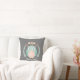 Um travesseiro que caracteriza um design temático da floresta com uma ilustração de uma coruja do bebê dentro de uma grinalda decorada com folhas, flores, e uma bolota. Personalize o nome. O fundo é teste padrão cinzento da viga.