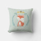 Um travesseiro que caracteriza um design temático da floresta com uma ilustração de uma raposa do bebê dentro de uma grinalda decorada com folhas, flores, e uma bolota. Personalize o nome. O fundo é claro - teste padrão azul do quatrefoil.