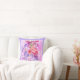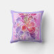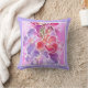 Um belo travesseiro ou almofada com flores de parede em tons românticos de rosa, lilás e mauve, com delicada borda de movimento pálida, de uma pintura aquosa feita por Judy Adamson.