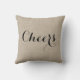 Este travesseiro decorativo rústico tem um acabamento falso de burlap e Cheers escritos em um script de fita de rico.