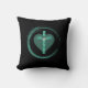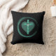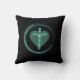 Cruze com um coração atrás dele dentro de um design de círculo num travesseiro decorativo verde esmeralda e fundo preto.