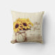Adicione os nomes dos noivos e a data do casamento a este travesseiro decorativo rústico do frasco de pedreiro dos girassóis do país com um fundo de madeira do celeiro e a um frasco de pedreiro pintado com arco da guita e buquê da flor do girassol. Estes são grandes para um travesseiro decorativo da lembrança do casamento do país.
