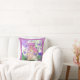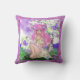 Travesseiro decorativo com uma moça de cabelos cor-de-rosa com borboletas voadoras e flores roxas.