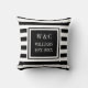 Travesseiro decorativo personalizado elegante de monograma com um padrão listrado preto e branco com suas iniciais e nome da família com a data estabelecida em um quadrado bordado preto com um texto branco clássico. Projetado por Thisnotme©