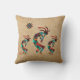 Este é um Travesseiro decorativo único "Um dos tipos" do sudoeste de Kokopelli! Ele apresenta três copelli sudoeste em Turquoise, dança negra e laranja e tocando a flauta debaixo do sol num fundo de couro bronzeado! Este é um Design de Arte Original do Artista Kerry Miller.