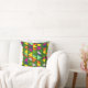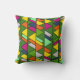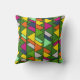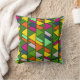 Este travesseiro decorativo tem um design moderno século médio de triângulos sobrepostos em cores floridas que correm verticalmente num campo de verde.