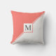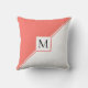Travesseiro decorativo de arquiteto de coral vivo com monograma. Inclui duas faixas diagonais, um coral e um branco que separam a placa em dois triângulos. Um quadrado branco está no centro com seu monograma.