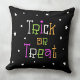 Travesseiro de sotaque de Halloween com o texto: "Trick or trata" em letras brancas, laranja verdes e roxas cercadas por estrelas sobre fundo preto. Todas as cores são personalizáveis na ferramenta design.