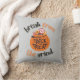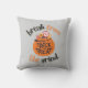 Um travesseiro com a frase "Break from the Grind" em letras negrito, acompanhado de um gráfico de uma abóbora de Halloween repleta de guloseimas, simbolizando uma doce e festiva fuga do dia a dia.
