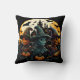 Três espantalhos brancos com chapéus coloridos e abóboras esculpidas ficam contra um pano de fundo assombroso de morcegos e um castelo, capturando a essência da noite de Halloween.