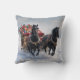 Dois cavalos negros estão puxando um trenó cheio de presentes coloridos de Natal através de uma paisagem nevada