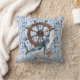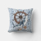 Composição náutica de um volante de madeira com tubarão e estrela e uma maruca capturada numa rede de pesca em fundo com padrão de índio. Esta almofada traz elegantemente o talento marítimo e náutico em sua casa.
